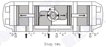 Position 2(wide open position): This position is carried out by the air supply pressure enter into port 2 and port C at the same time(C port may haven't air go through), the air expel from port 4 and port D. In this case, the air pressure expel from the port 2 constantly to make the internal piston to wide open position. |